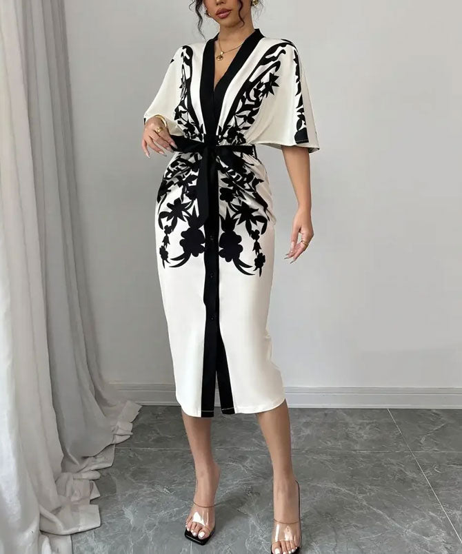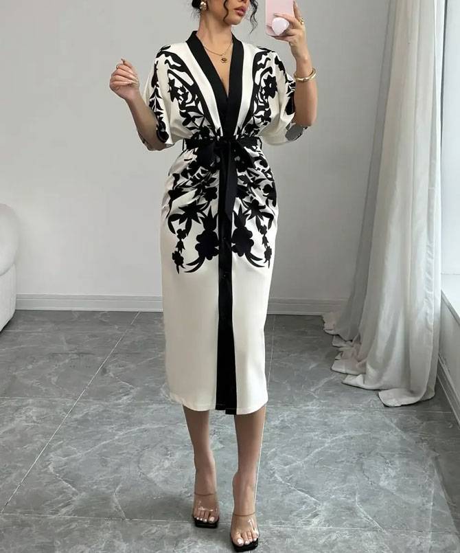 Made from a soft and comfortable polyester blend, this dress feels as good as it looks. The black floral print pops beautifully on the ivory-cream fabric, giving you that elegant “wow” factor without even trying. The flowy kimono-style sleeves add a touch of drama, while the matching fabric belt pulls your waist in just right. The Noir Print Midi Dress is flattering, feminine and so easy to wear.