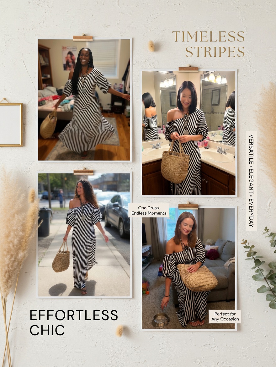 This elegant maxi dress is crafted from lightweight black chiffon and features a delicate striped print, creating a modern urban look. The off-shoulder neckline beautifully accentuates the collarbone, while the flowing A-line skirt allows for light and graceful movement, showcasing an elegant demeanor. This dress is designed for all-day comfort, combining romance with urban chic.