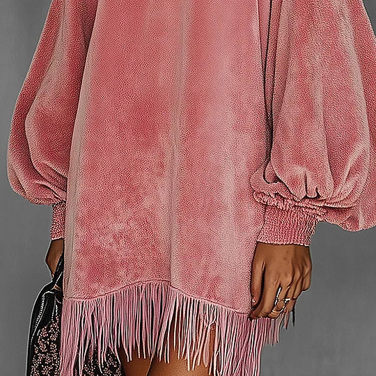 Soft, plush, and effortlessly stylish—this pink velvet fringe dress is your go-to piece for chic autumn and winter outfits 🍂