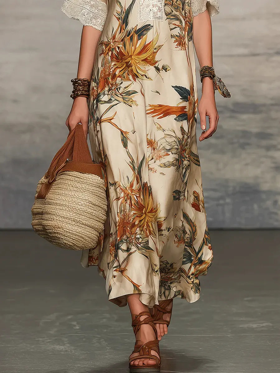 • Women's Retro Floral Art Casual Stylish Short Sleeve Dress