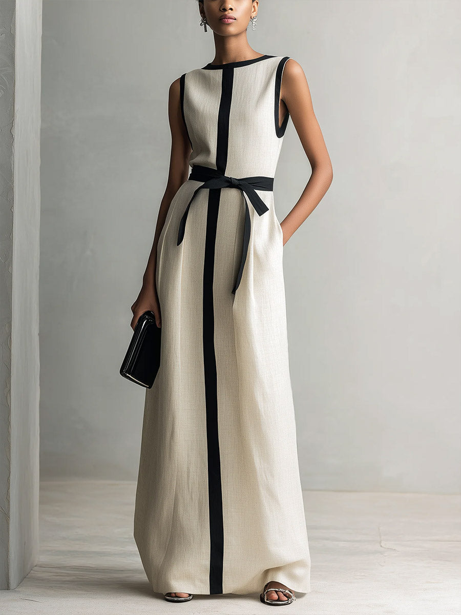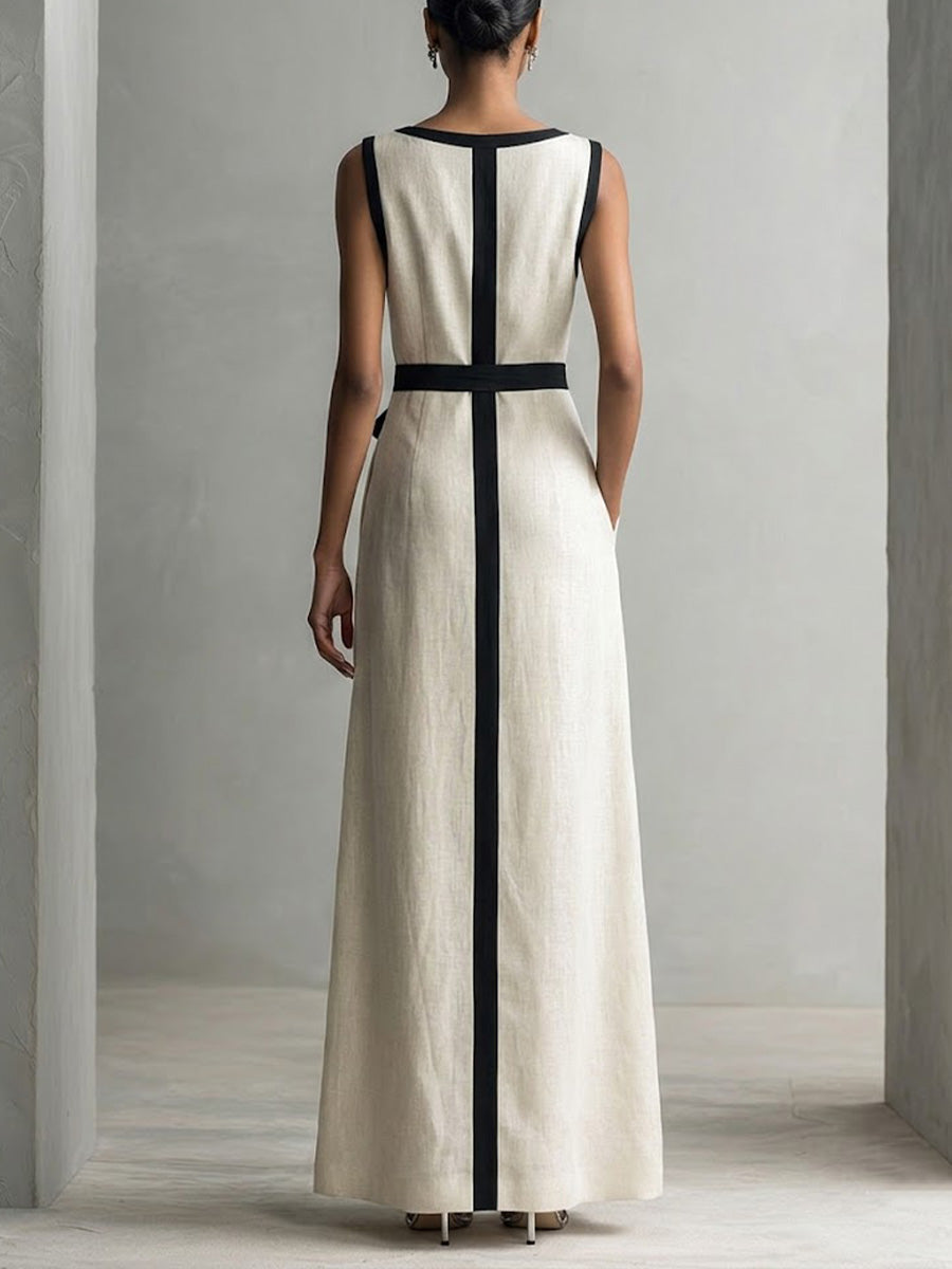 Casual Urban Color-blocked V-neck Beige Cotton Linen Maxi Dress